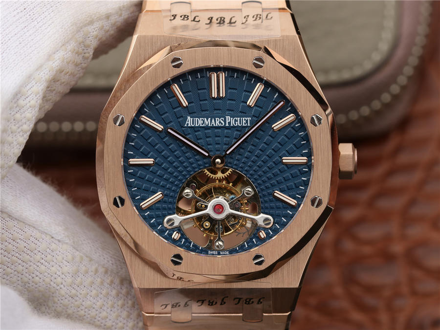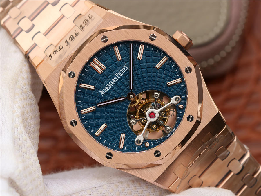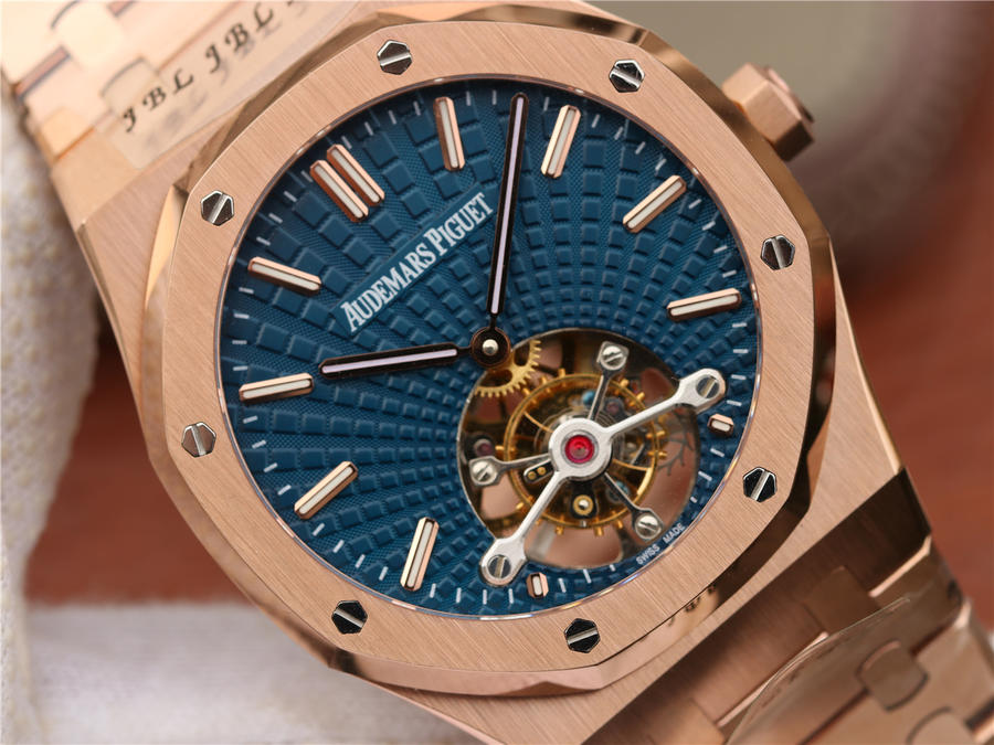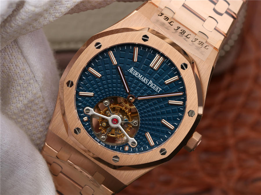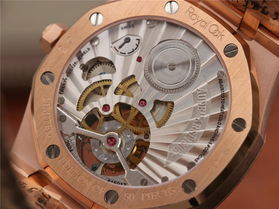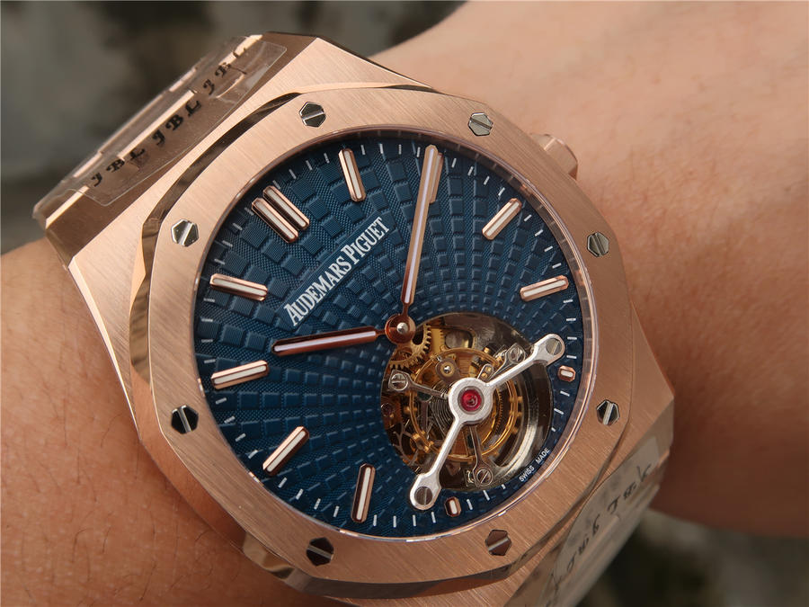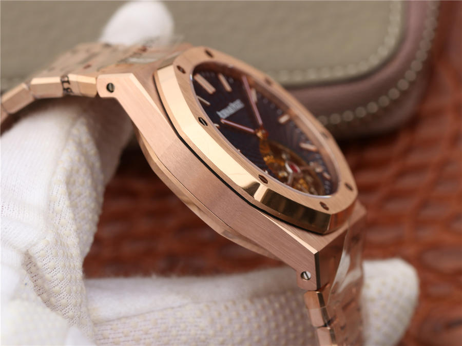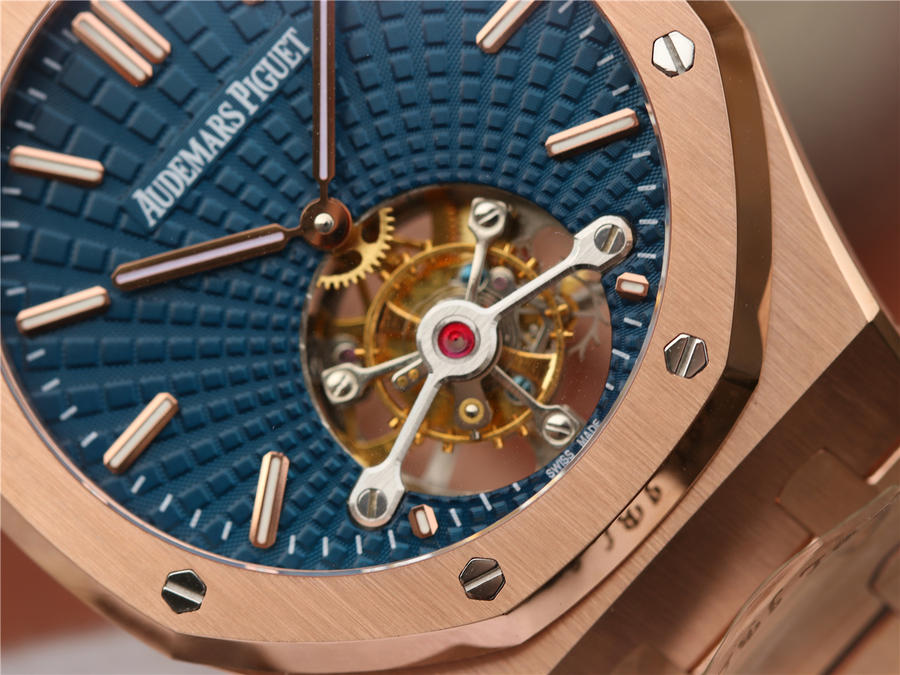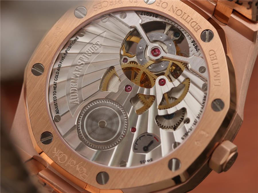 R8最新力作.AUDEMARS PIGUET 【皇家橡樹陀飛輪腕表】型號:26515OR.OO.120OR.01千變萬化的圖案,對比與色彩,探索全新途徑,心靈與眼眸共同領略的高級制表傳奇。愛彼標誌性的“Tapisseris”格紋設計演變為光彩奪目的放射紋圖案,首次推出五枚全新皇家橡樹系列陀飛輪腕表。搭配Cal.2924陀飛輪手動上鏈機芯,動力儲存為80小時,表殼直徑41mm厚度12.4毫米。