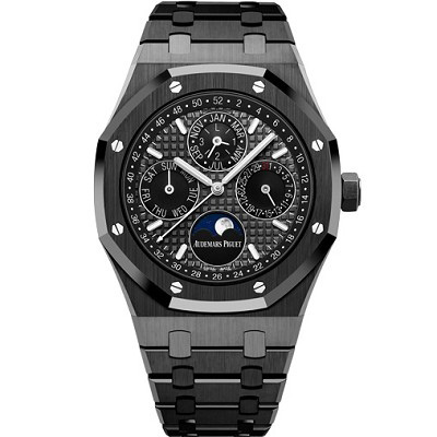 JF愛彼皇家橡樹26579。功能:日期顯示、星期顯示、月份顯示、年歷顯示、萬年歷、月相進口機克隆原裝5134自動機械機芯,41毫米,男士手表腕表鍍K金擺陀動力儲備:40小時表盤材質:鐫刻" Grande Tapisserie"大格紋裝飾圖案, 搭配白金熒光立體時標和皇家 橡樹指針,銀色內表圈