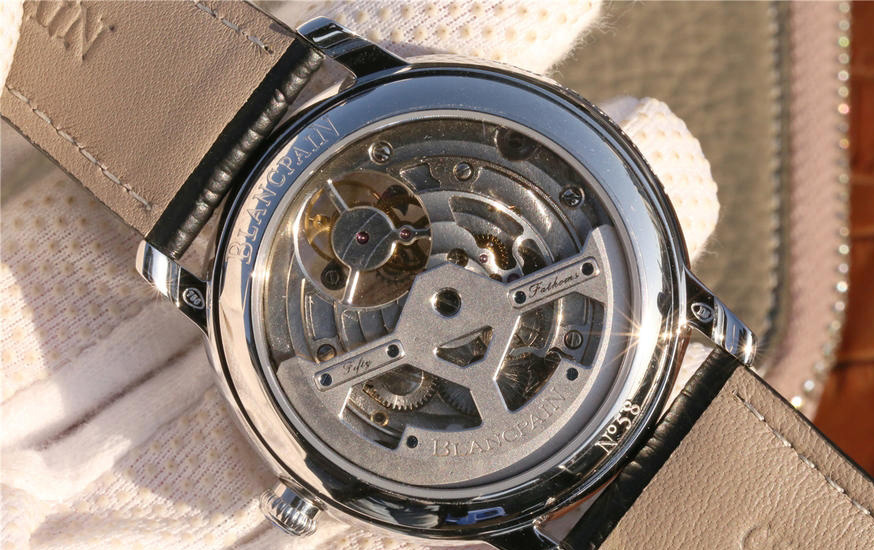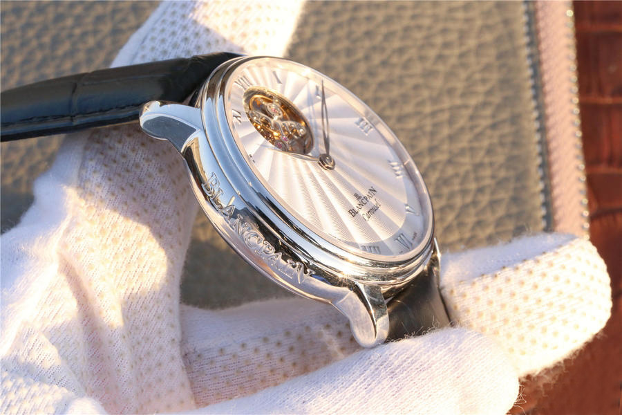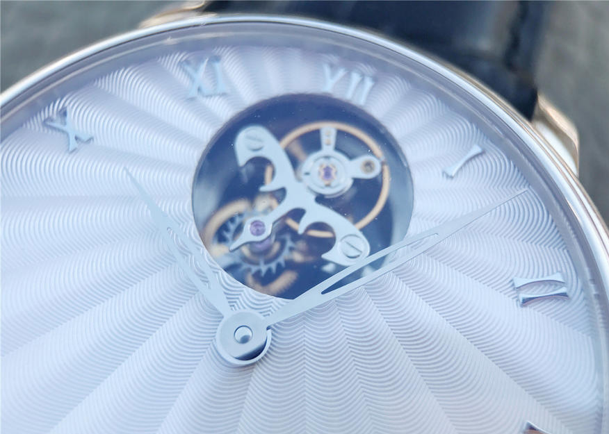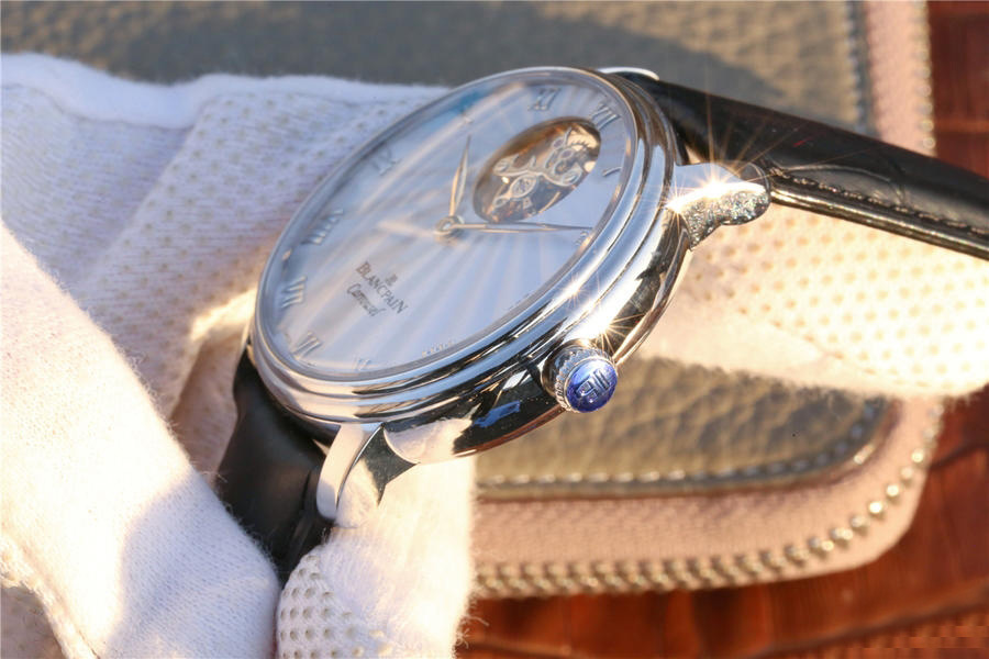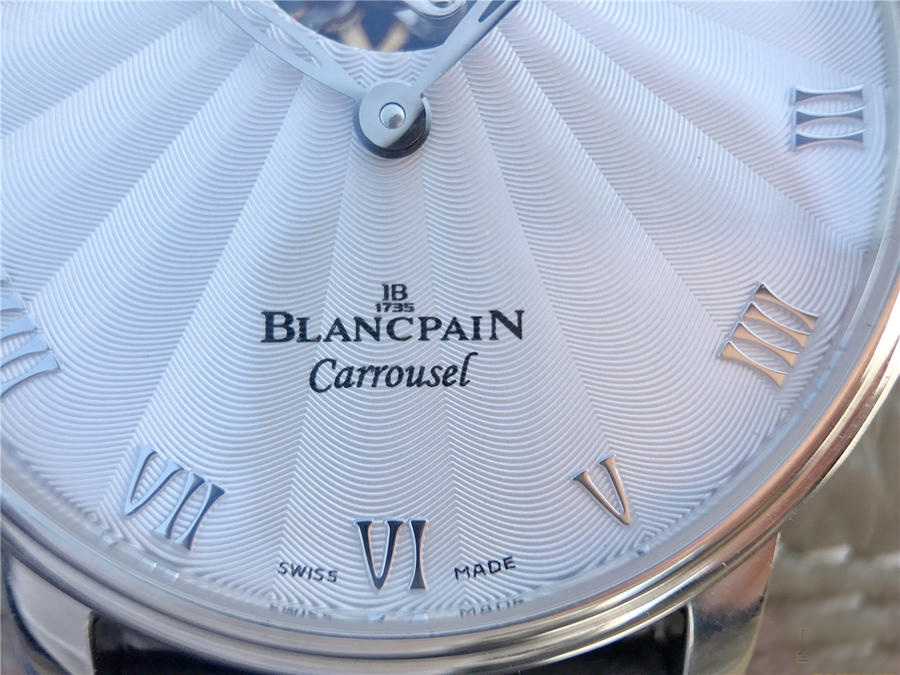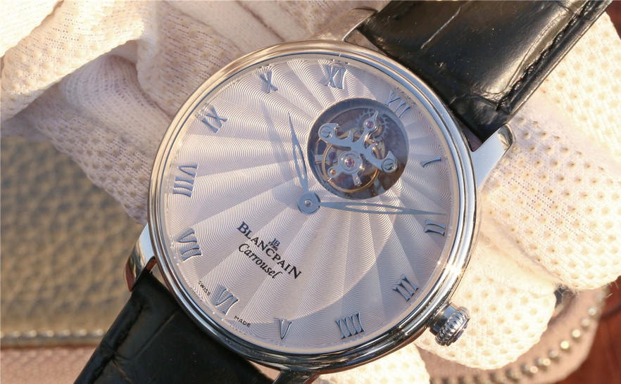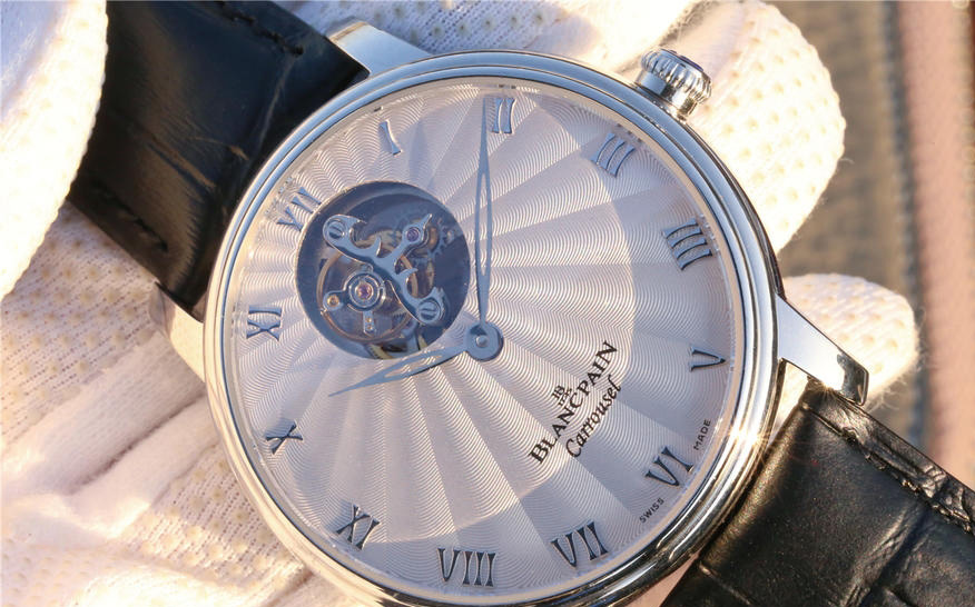 寶珀經典系列66228自動真陀飛輪腕表。腕表尺寸42mm。前後均采用藍寶水晶玻璃鏡面,透過12點鐘位置的加大浮動陀飛輪框架,可以從表盤上壹覽平衡擺輪和擒縱輪的全貌,感受機械之美。陀飛輪每分鐘旋轉運行壹周(360度),以此抵消分散重力對於機械零件的影響,從而提高腕表走時精準度。表盤和時標刻度皆采用琺瑯工藝,華麗亮澤,搭配鏤空柳葉形指針輕盈優雅。整體高檔大氣,經典。