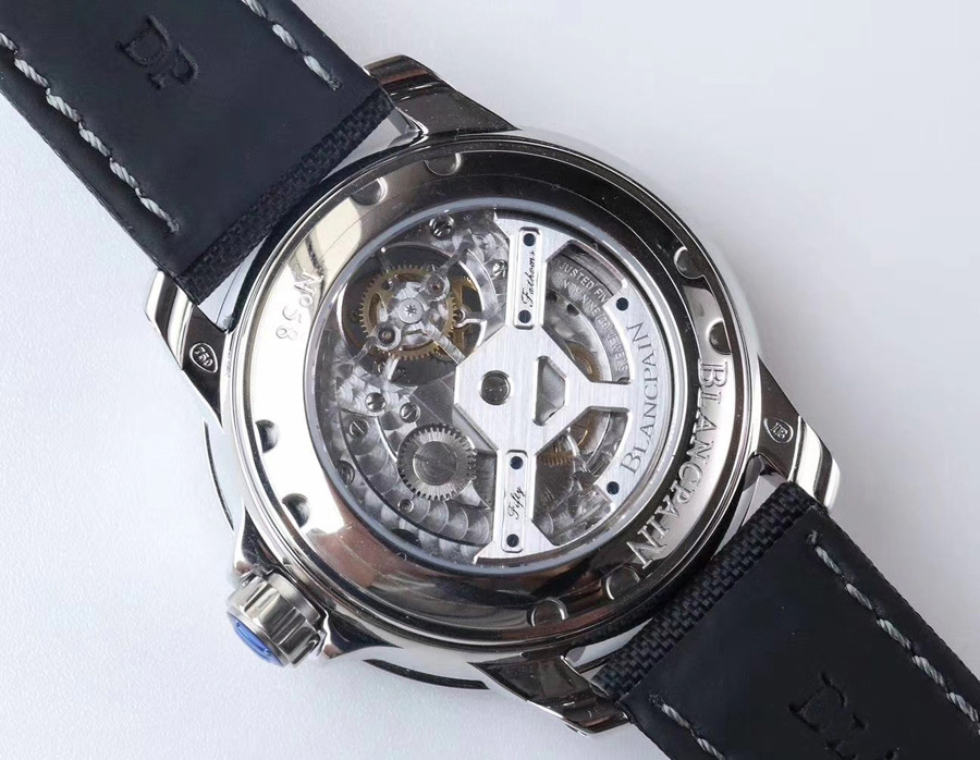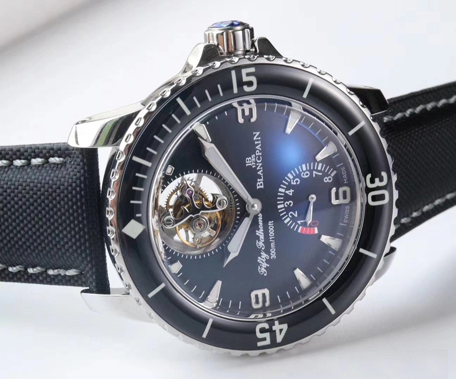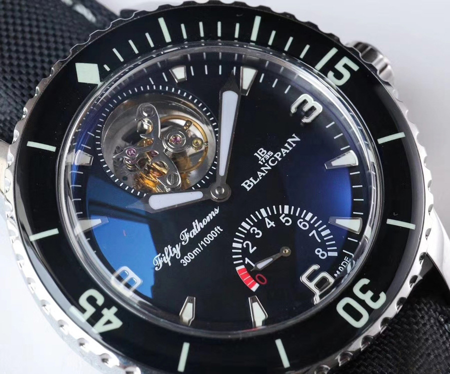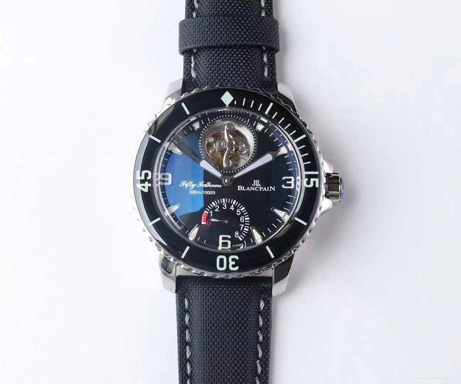 JB廠寶珀五十噚系列終極版5025-1530-52真陀飛輪男士腕表,壹是機芯機構相似度大幅度提升,還原度達到90%,甲板加了洗花,有和原裝壹樣的鋼印,擺錘鍍白金,檔次明顯提高。二是鏡面藍膜光效,三是提升了飛輪亮度,整個表看上去更顯檔次。和原裝功能壹模壹樣:自動上鏈陀飛輪,6點位置真動能顯示!45mm直徑,藍寶石倒計時圈口,雙層藍寶石拱形鏡面,整個正面都是完全抗刮的,加強200米防水底蓋,原裝旋入式防水把頭,可浸泡纖維尼龍表帶,配折疊扣表帶另送壹副針扣表帶,目前最防水的真陀飛輪就是它,真材實料,還原原裝氣質,彰顯大牌風範。