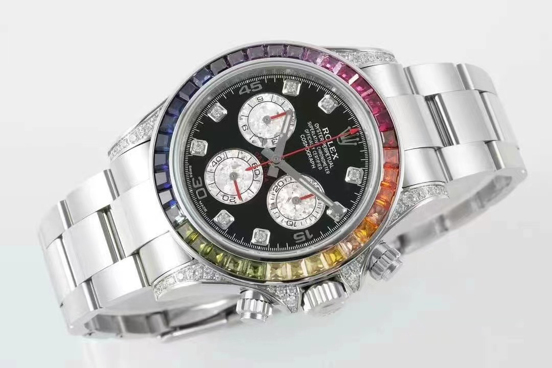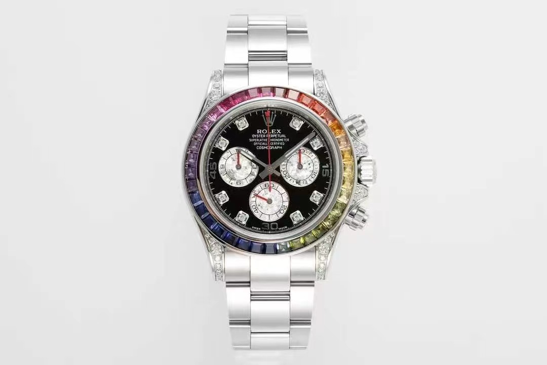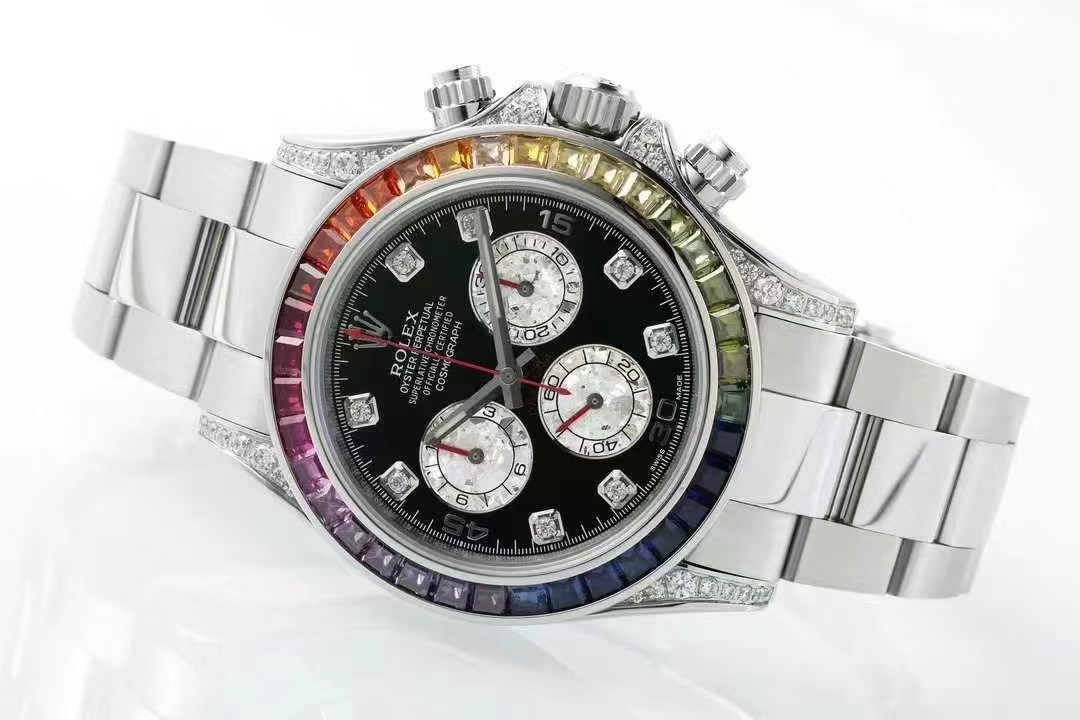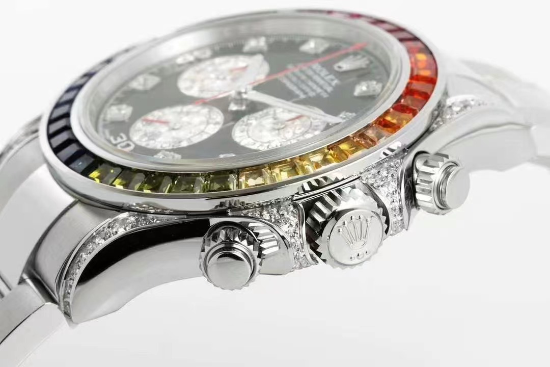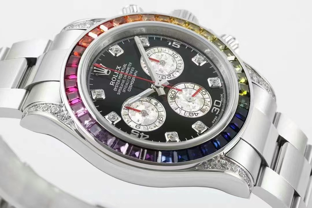 彩虹Daytona的精髓就在于顔色漸變的外圈寶石。天然的寶石或多或少都有缺陷,采用的寶石會進行優化處理,以達到純淨、透亮、濃郁的質感。ZF廠在數以萬計的寶石中挑選、搭配出了顔色漸變過渡最協調的那36顆。最爲艱難的是,腕表是小規模量産款,所需的漸變寶石不是止一組,而是至少幾十組,這樣才能夠生産相應只數的手表,導致産量十分稀少。