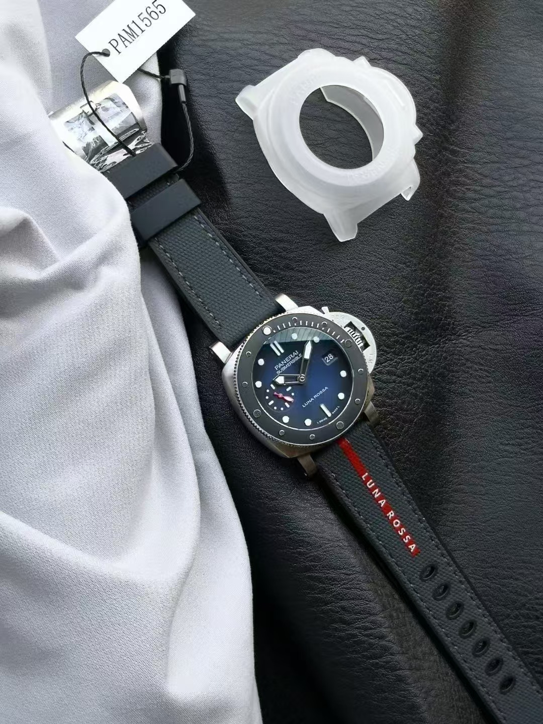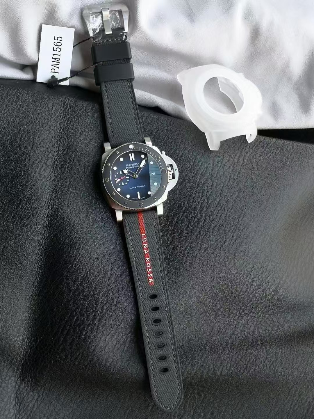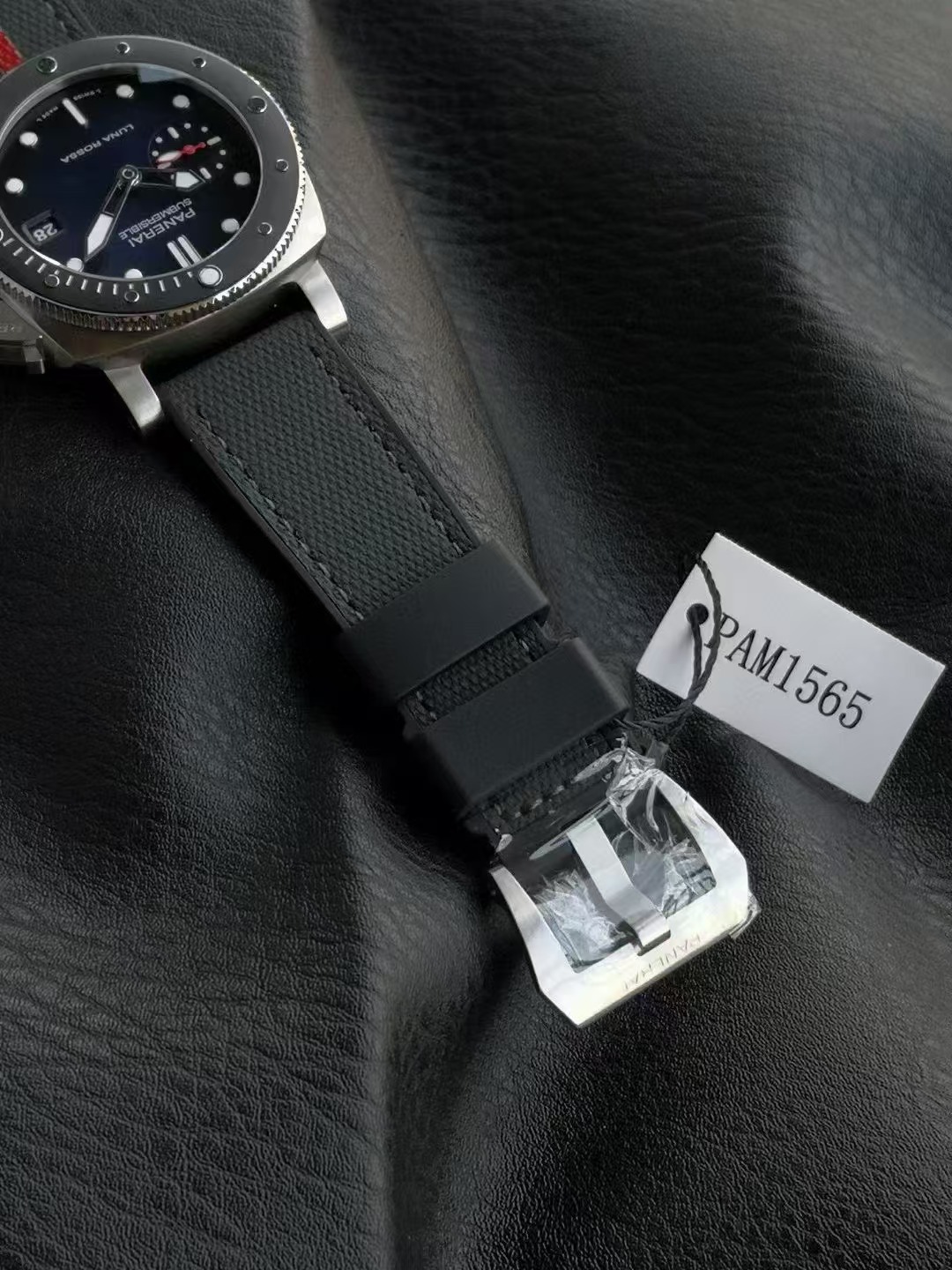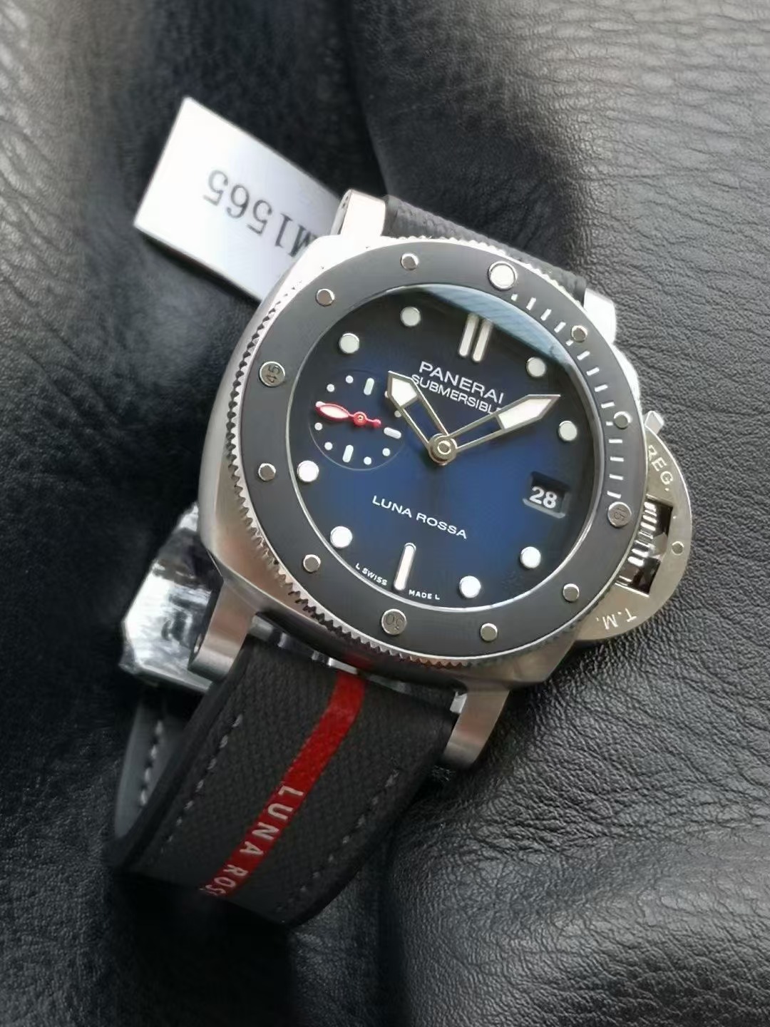 沛納海潛行系列PAM01565腕表,精鋼表殼搭配Luna Rossa面料與橡膠雙材質表帶,單向旋轉精鋼表圈,鑲嵌黑色啞光陶瓷,藍寶石水晶玻璃。藍色太陽放射紋表盤,夜光阿拉伯數字及小時標示;3點鍾位置設置日期窗,9點鍾位置設小秒盤。搭載CAL.P.900型自動機械機芯,尺寸:42毫米。
