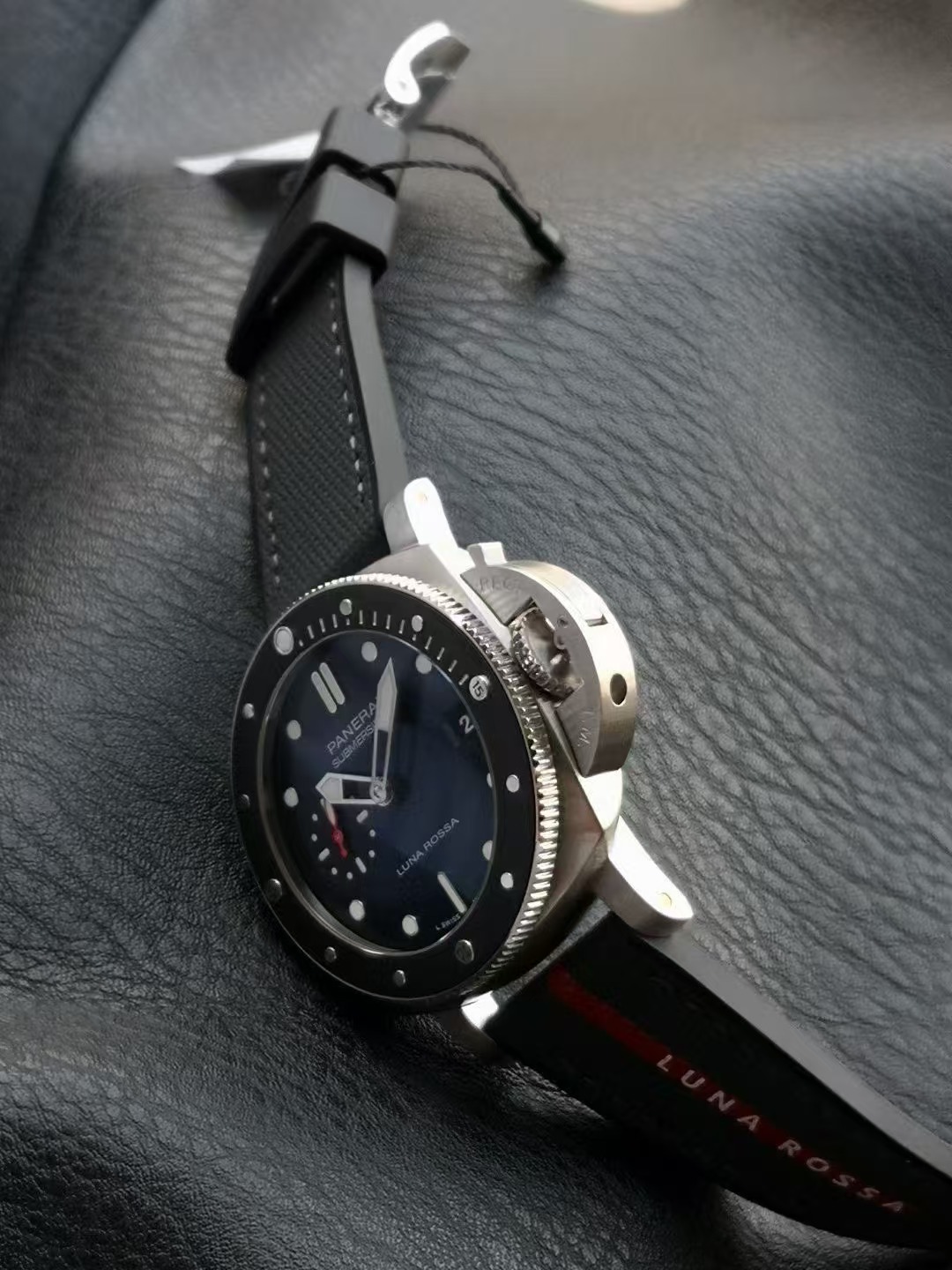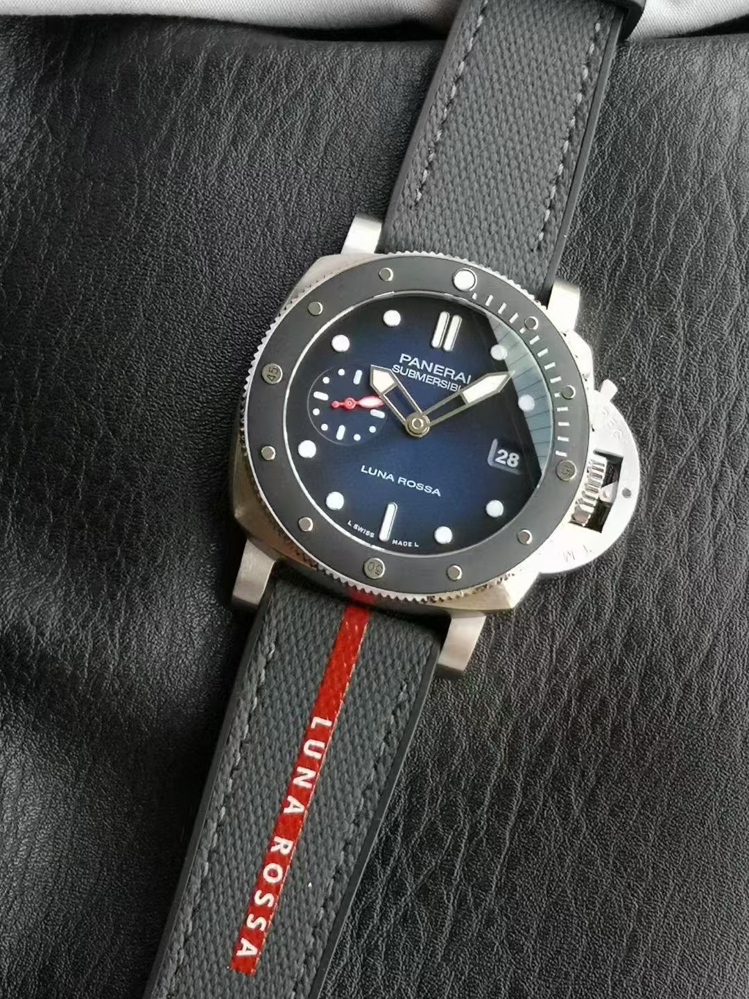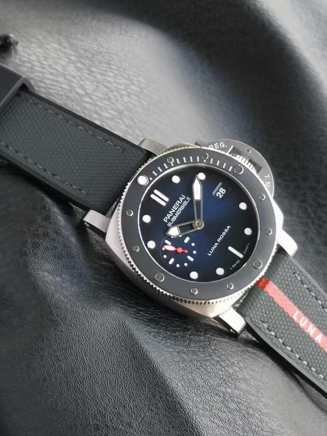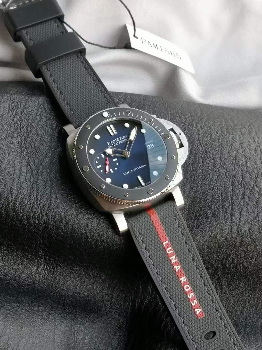 沛納海潛行系列PAM01565腕表,精鋼表殼搭配Luna Rossa面料與橡膠雙材質表帶,單向旋轉精鋼表圈,鑲嵌黑色啞光陶瓷,藍寶石水晶玻璃。藍色太陽放射紋表盤,夜光阿拉伯數字及小時標示;3點鍾位置設置日期窗,9點鍾位置設小秒盤。搭載CAL.P.900型自動機械機芯,尺寸:42毫米。