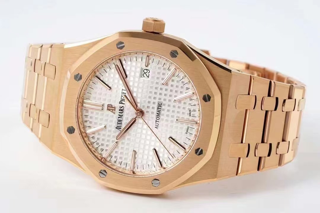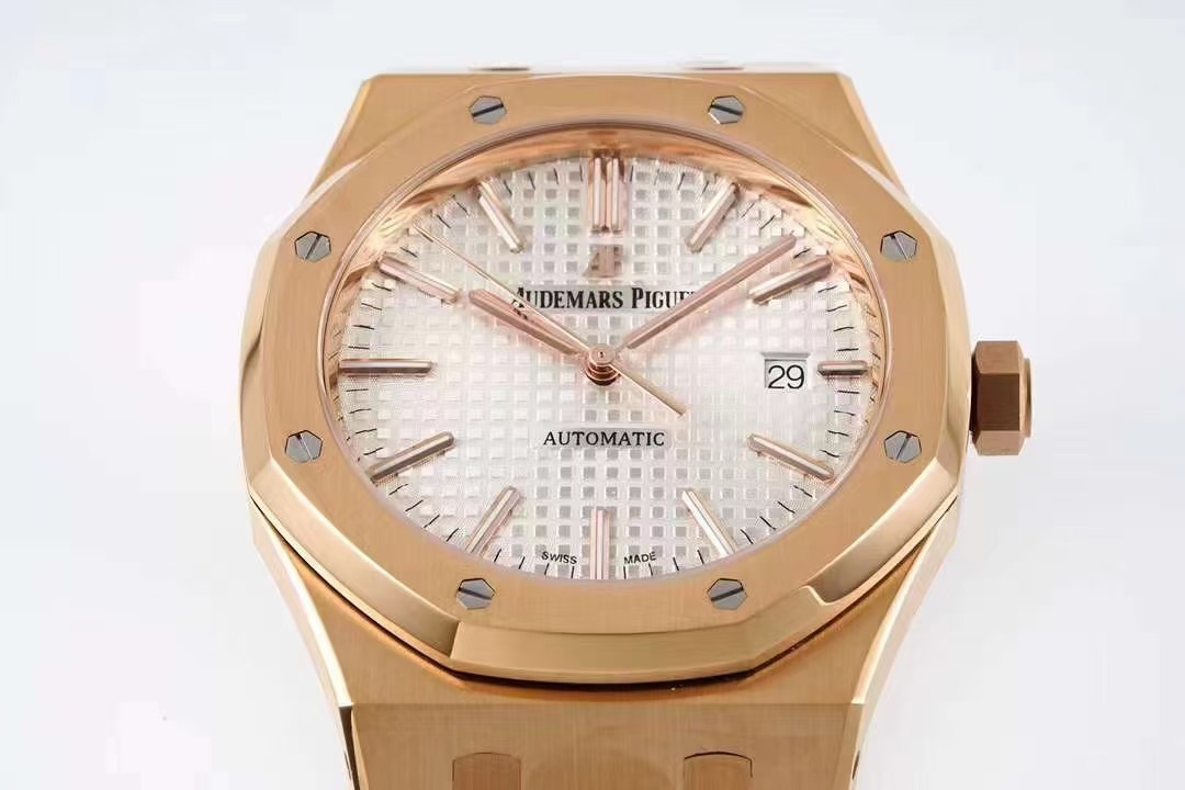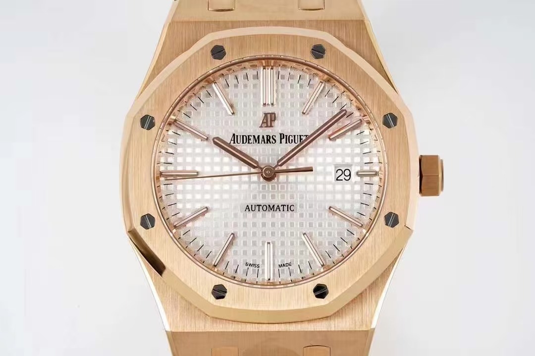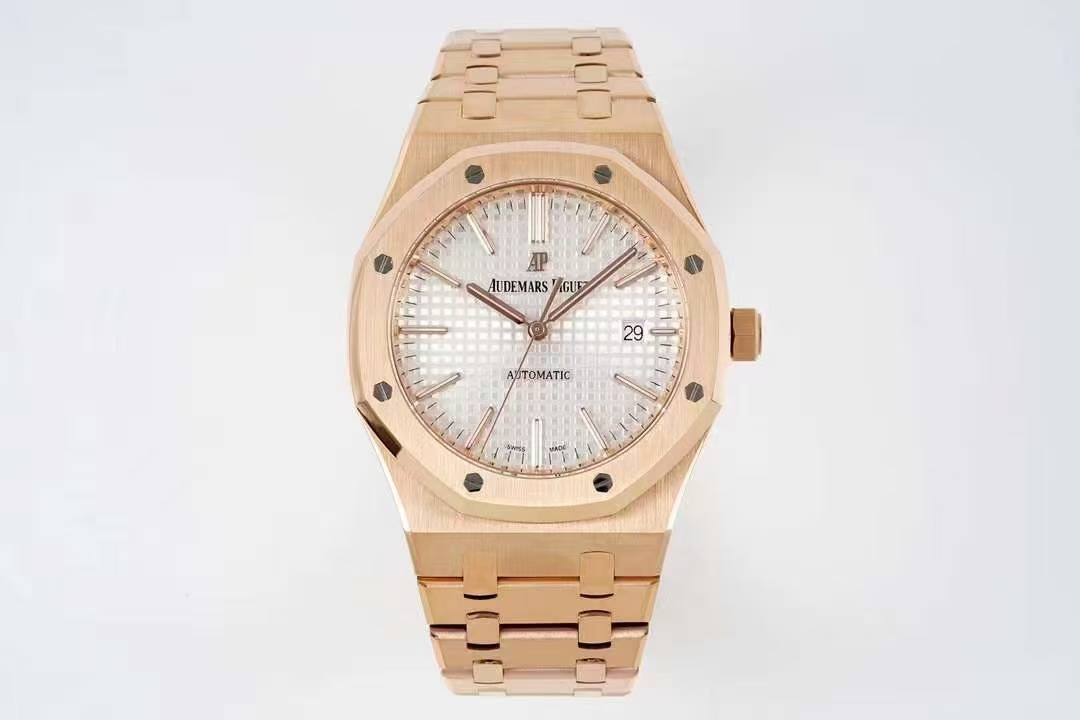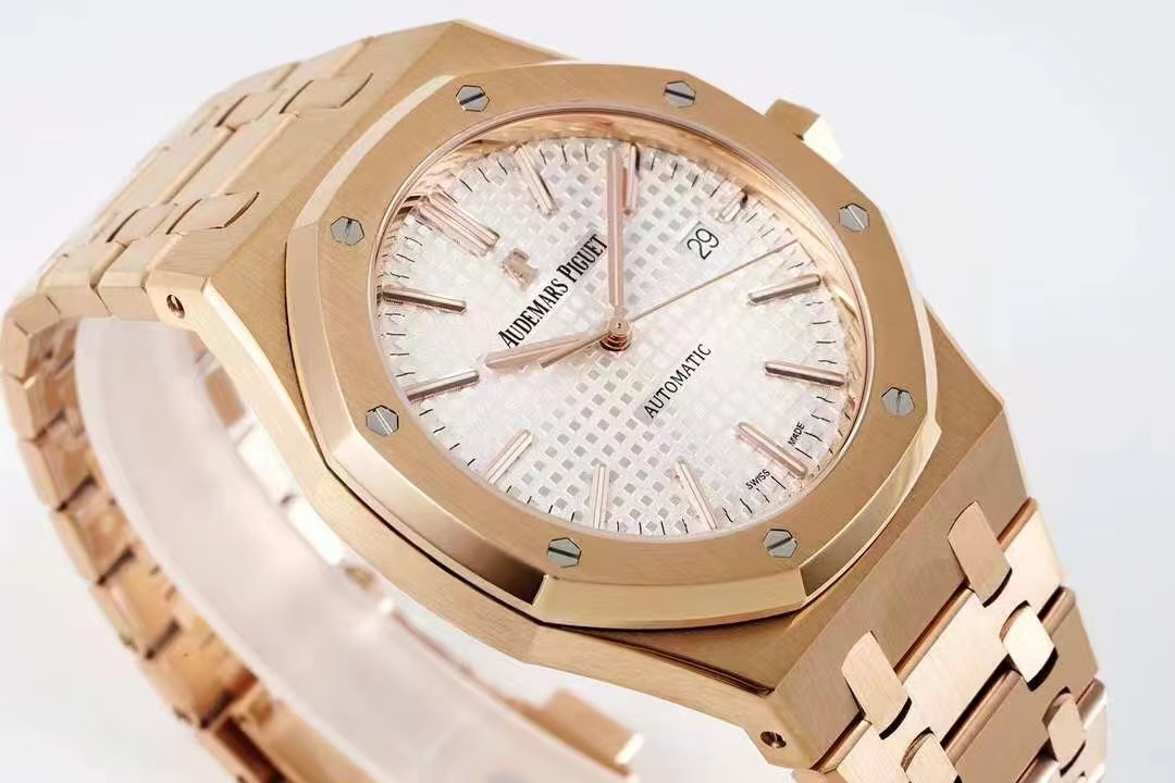 殿堂級之作--“玫瑰金”AP皇家橡樹系列15400OR《一體機CAL.3120》表殼采用瑞士4N玫瑰金,色澤純正,不生鏽,抗腐蝕,符合國際和行業標准。可以說是目前市面上唯一的“極限版”15400OR。一體式表殼和八角舷窗表圈,六角螺絲略微凹陷于表殼媲美正品。坦克履帶型表帶的松緊感和細膩質感與原版相差無恙,弧度流暢。表盤“TAPISSERIE”格紋橫豎整齊排列裝飾表盤搭配白金熒光立體時標和皇家橡樹指針.(以上細節如見實物更是驚豔)。全新研發的一體機CAL.3120 擺輪位置對應正品在7點位置,平面遊絲(Flat).甲板上的齒輪與發條盒均真實可動可用。動力儲備時間與原版一致的41小時。ZF 15400OR全新全面全升級,讓你一見鍾情,在喜歡的年紀就能擁有!