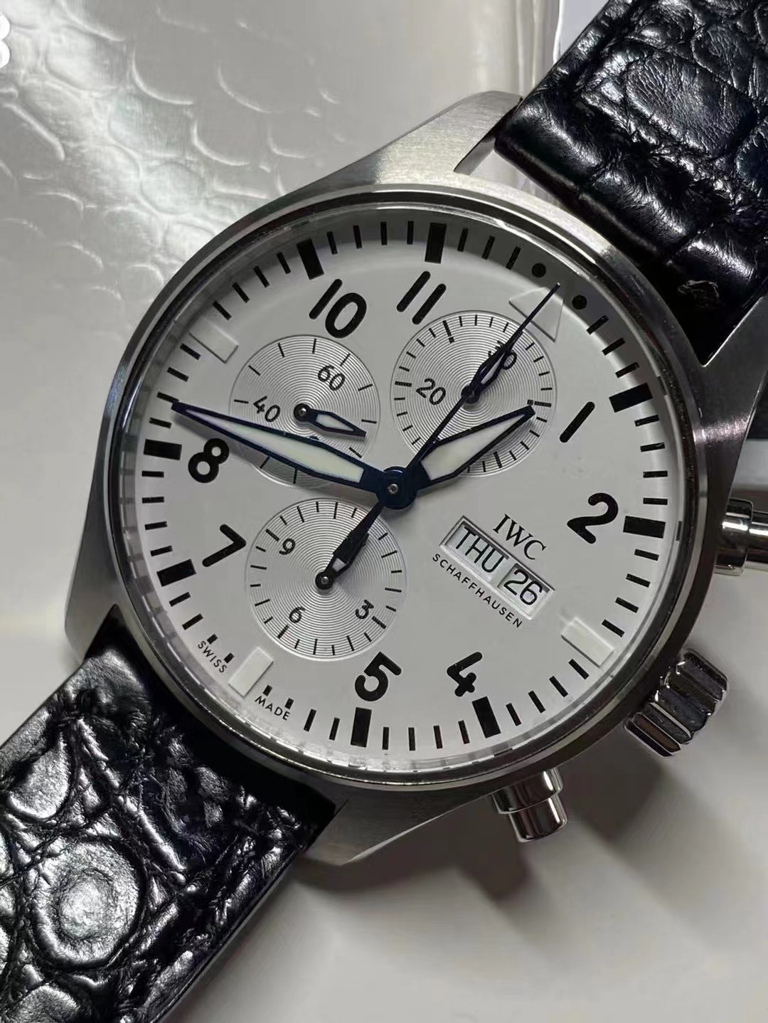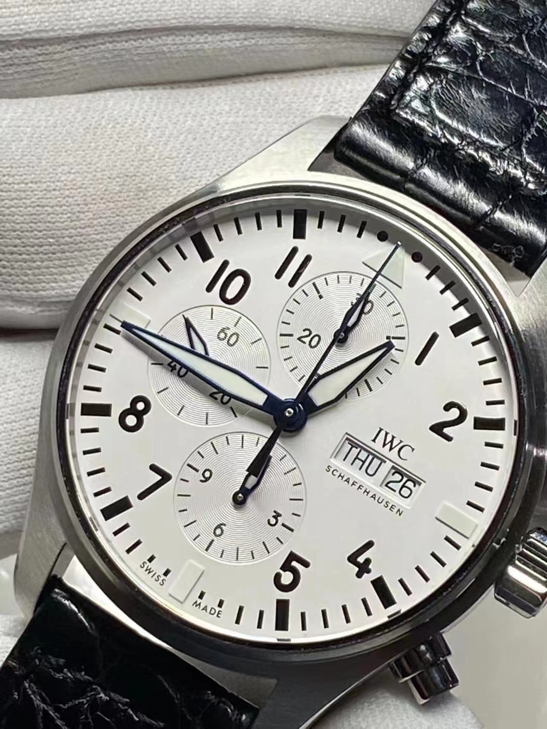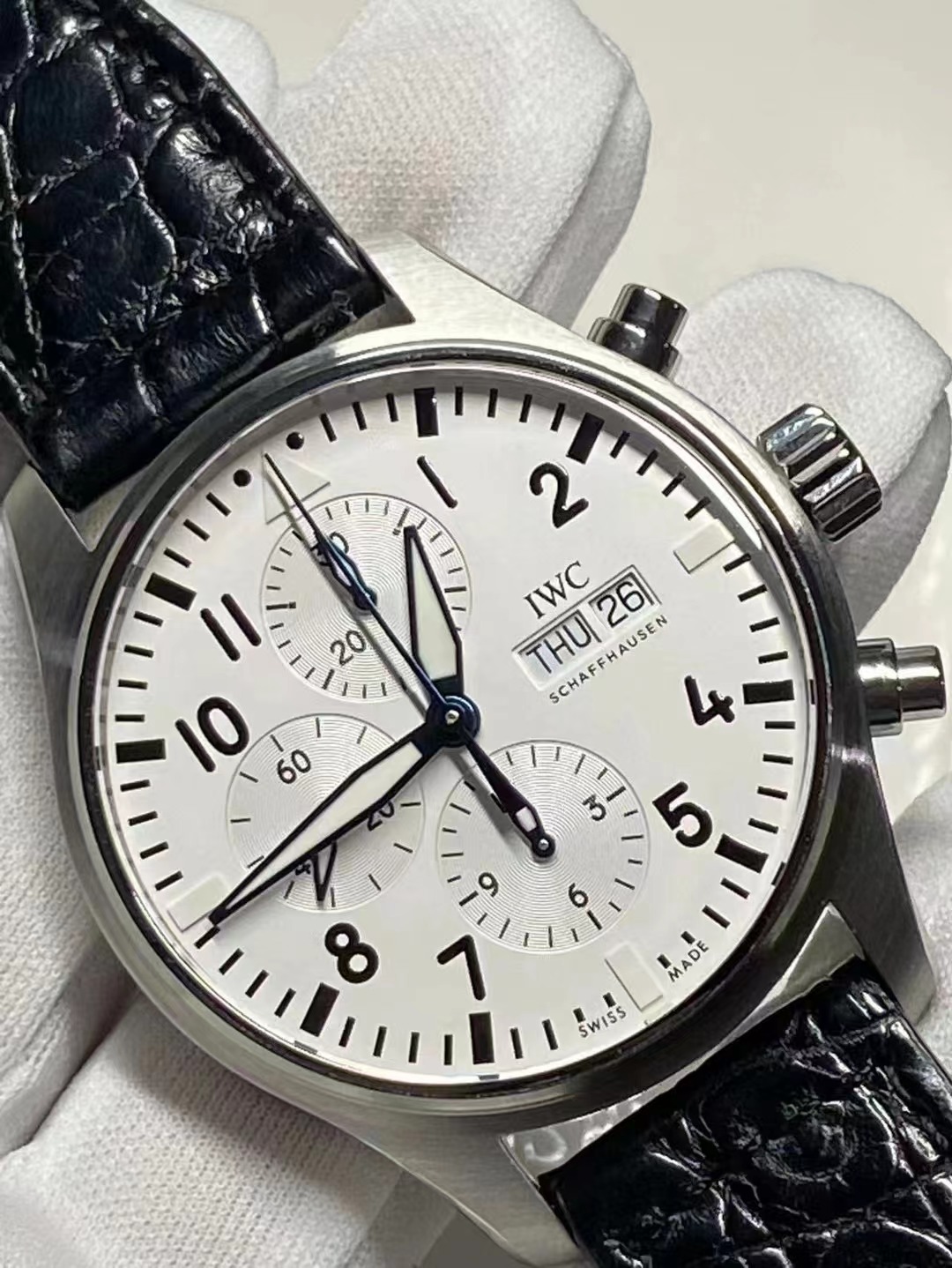 原單!缺個經銷商印章就是正品!大名鼎鼎的萬國柏濤菲諾周年紀念款 腕錶界的Gentleman,永遠像個紳士一般存在,簡潔風格,原裝7750自動機械機芯(也就是萬國自己命名的79320),防眩目藍寶石玻璃,黑色美洲鱷魚皮錶帶,大部分男人理想中的錶款:錶盤幹凈、輕薄、低調且有內涵。正裝42mm錶徑,鍍銠柳葉針造型百看不膩,我們拿到的是2018年日內瓦錶展,150周年限量款!專櫃都一錶難求!保卡、吊牌和外包裝都有貼標型號及手錶身份編號,能拿到這麼完美的貨,真是為妳們感到幸福!性價比無