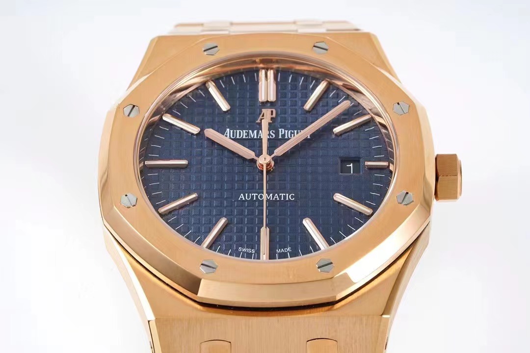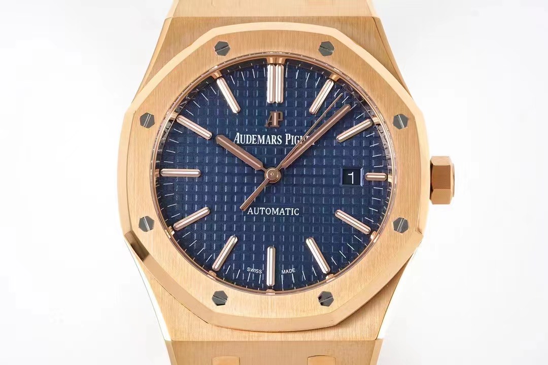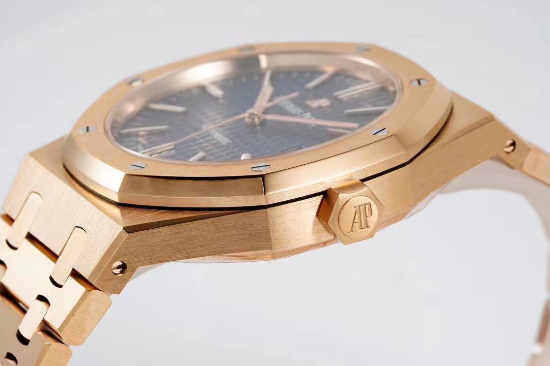 AP皇家橡樹繫列15400OR《一體機CAL.3120》錶殼採用瑞士4N玫瑰金,色澤純正,不生銹,抗腐蝕,符合國際和行業標准。可以說是目前市面上唯一的“極限版”15400OR。一體式錶殼和八角舷窗錶圈,六角螺絲略微凹陷於錶殼媲美正品。坦克履帶型錶帶的鬆緊感和細膩質感與原版相差無恙,弧度流暢。錶盤“TAPISSERIE”格紋橫豎整齊排列裝飾錶盤搭配白金熒光立體時標和皇家橡樹指針.(以上細節如見實物更是驚艷)。全新研發的一體機CAL.3120 擺輪位置對應正品在7點位置,平面遊絲(Flat).甲闆上的齒輪與發條盒均真實可動可用。動力儲備時間與原版一致的41小時