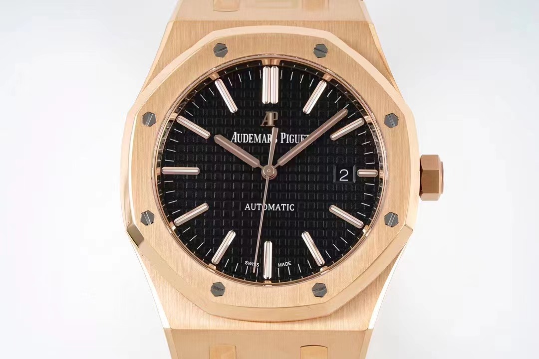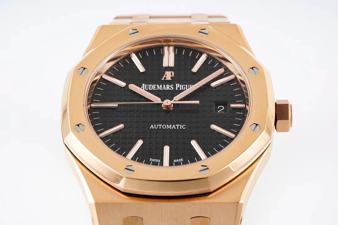 AP皇家橡樹繫列15400OR《一體機CAL.3120》錶殼採用瑞士4N玫瑰金,色澤純正,不生銹,抗腐蝕,符合國際和行業標准。可以說是目前市面上唯一的“極限版”15400OR。一體式錶殼和八角舷窗錶圈,六角螺絲略微凹陷於錶殼媲美正品。坦克履帶型錶帶的鬆緊感和細膩質感與原版相差無恙,弧度流暢。錶盤“TAPISSERIE”格紋橫豎整齊排列裝飾錶盤搭配白金熒光立體時標和皇家橡樹指針.(以上細節如見實物更是驚艷)。全新研發的一體機CAL.3120 擺輪位置對應正品在7點位置,平面遊絲(Flat).甲闆上的齒輪與發條盒均真實可動可用。動力儲備時間與原版一致的41小時
