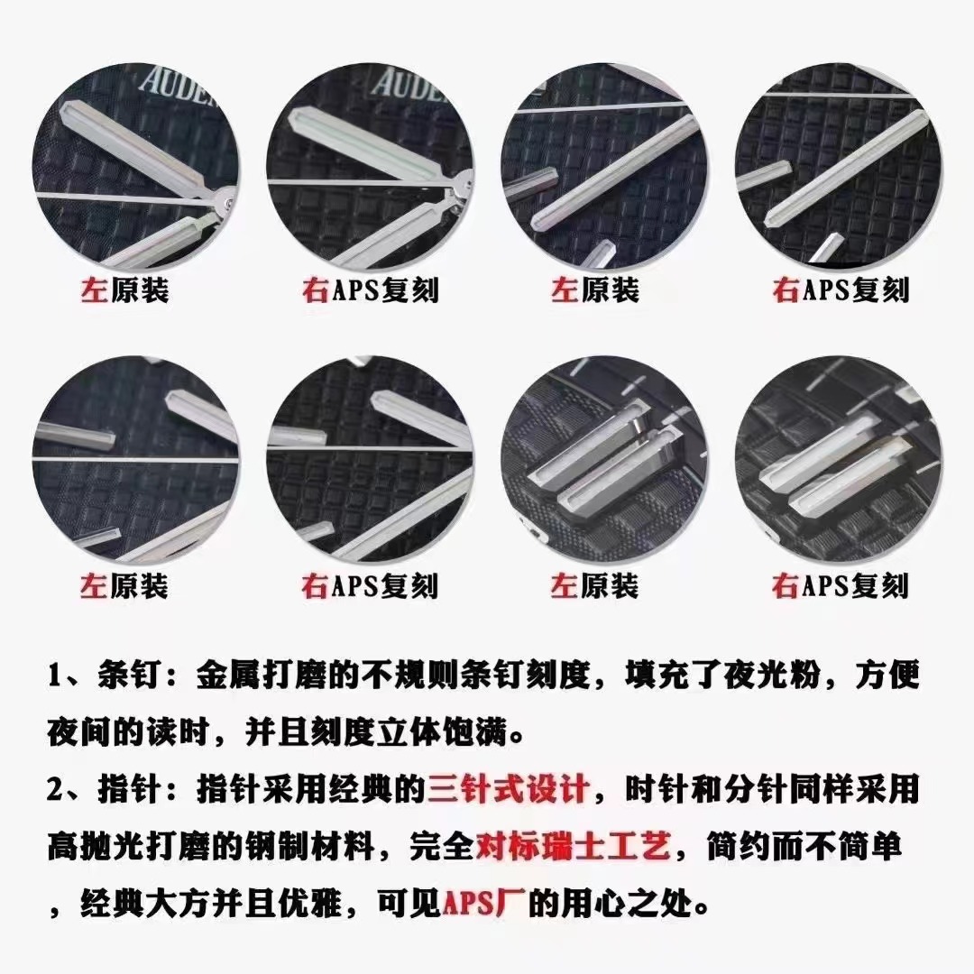 震撼上線:採用4302一體機芯——成就鋼錶巔峰—— 實力演繹 衛冕“鋼”王!【5大精妙之處】 1.正品拆解開模,尺寸為41X10.4毫米與正品一致! 2.完美還原正品錶殼的每一處細節,盡顯正品“棱角分明 堅毅果敢”的陽剛氣質。 3.鋼帶的做工無可挑剔,比市面上任何鋼帶錶做工均要更上一層樓,鋼帶頭粒和錶頭銜接的“緩沖帶”的鬆緊程度與正品一模一樣。 4.CAL.4302一體機!動力長達72小時更穩定,更優秀,更真實。 5.錶盤的“餅幹紋理”立體飽滿,精神抖擻!絕非普通小廠一般失魂落魄。體驗精妙 感受不同!
