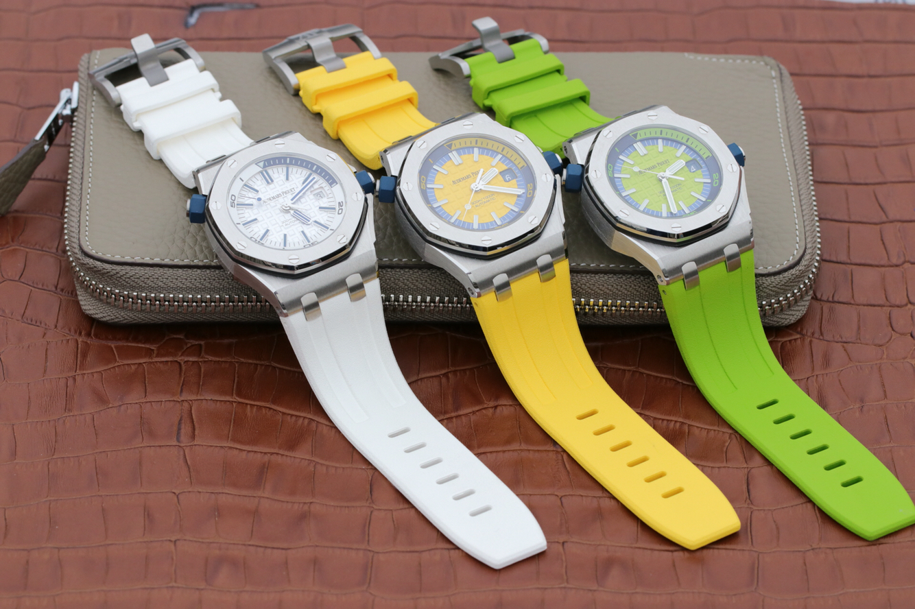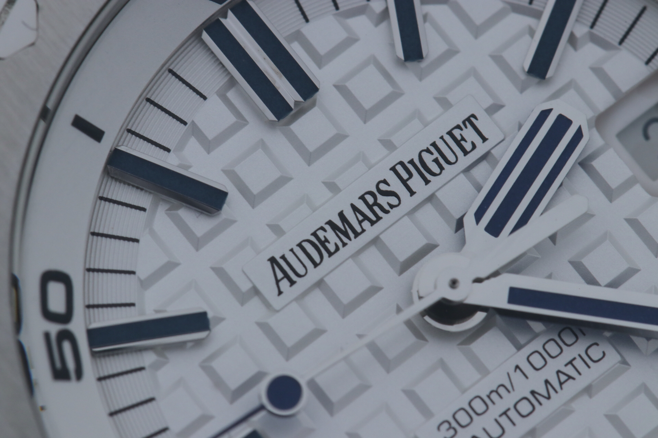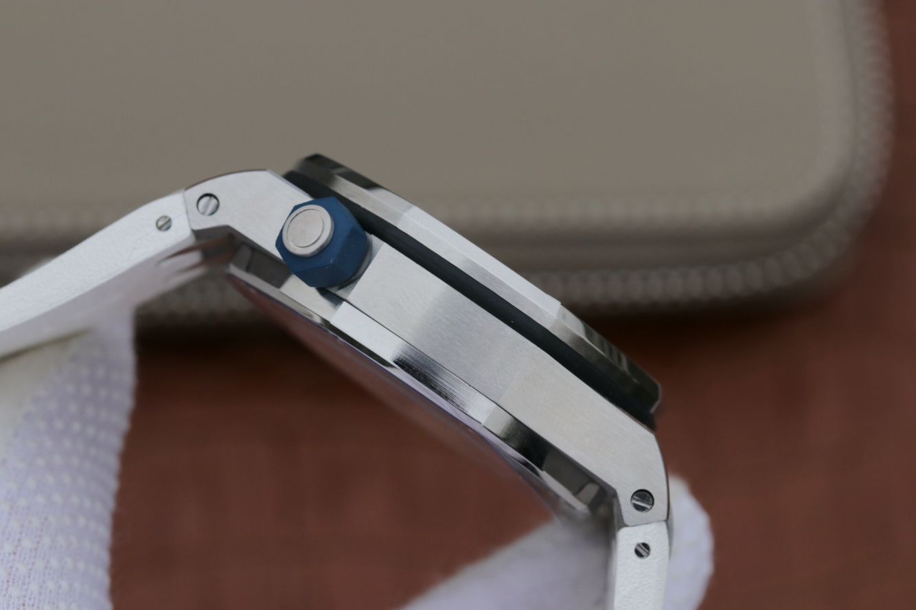 JF愛彼v8皇家橡樹15710ST,2017年新款夏季彩色系列,克隆正品3120全自動機械機芯。表徑:42毫米。表殼厚度:14.1毫米。鐫刻"Méga Tapisserie"超大格紋裝飾,搭配白金熒光立體時標和皇家橡樹指針,藍色旋轉內表圈搭配潛水刻度和黃色0至15分鐘區域,表鏡材質:防眩光處理藍寶石水晶.防水深度:300米
