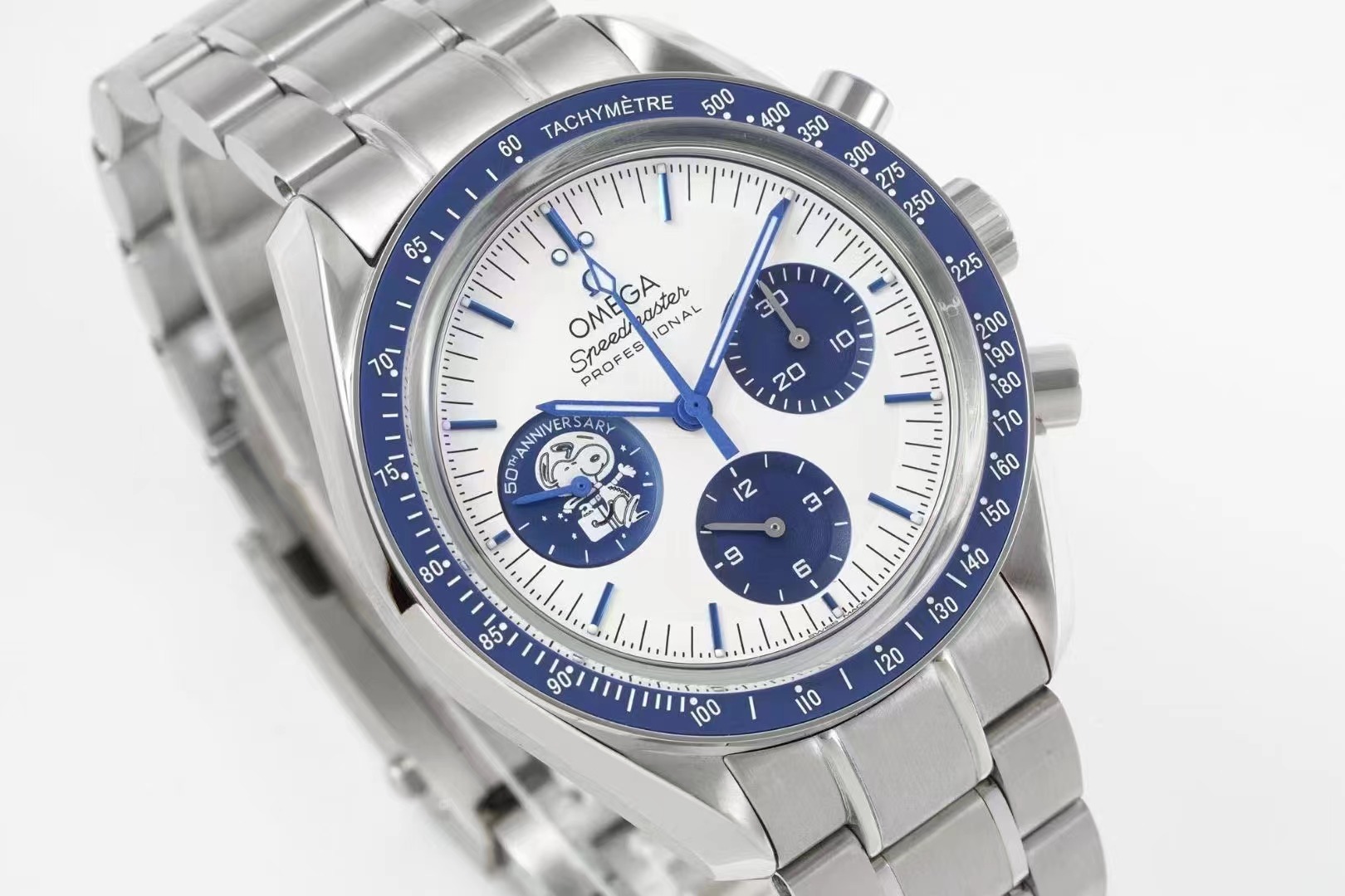 歐米茄 OMEGA 超霸繫列310.32.42.50.02.001腕錶(史努比獎”50周年紀念腕錶),精鋼錶殼,藍色氧化鋯[ZrO2]陶瓷錶圈,併飾以白色琺瑯測速刻度,銀白色錶盤飾有經藍色PVD處理的尖角形時標和指針,密底,飾有致敬“阿波羅”13號任務及歐米茄“史努比獎”等黑色鐫刻元素,定制3861型手動機械計時,42毫米。