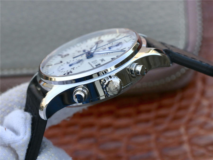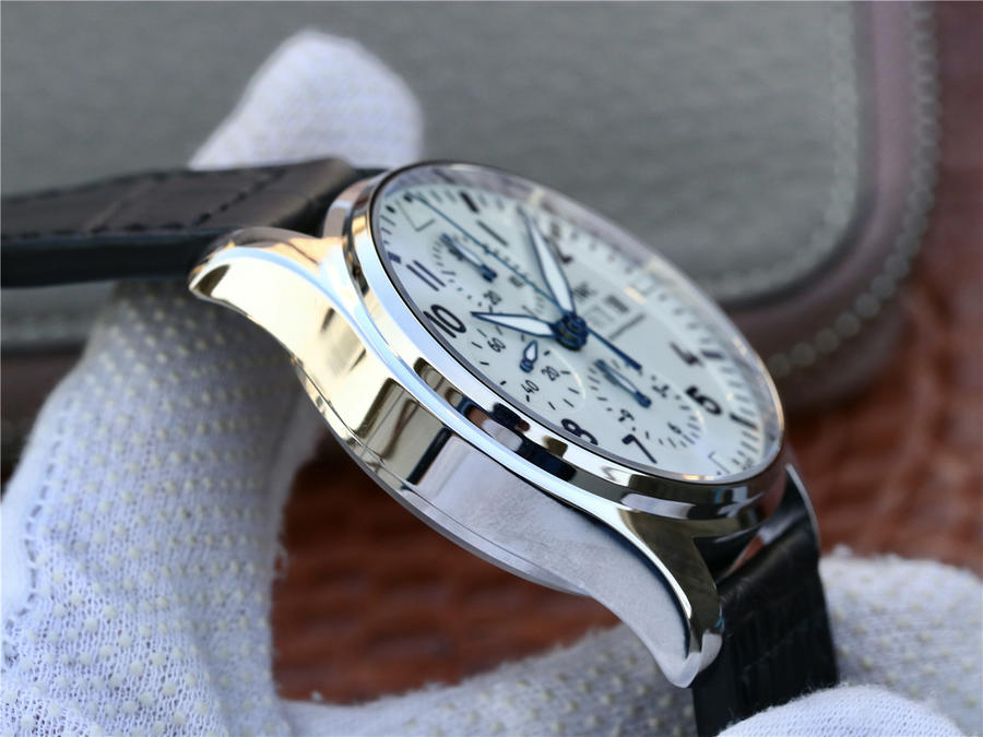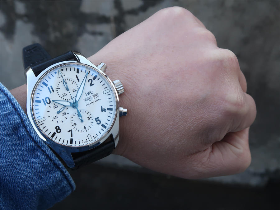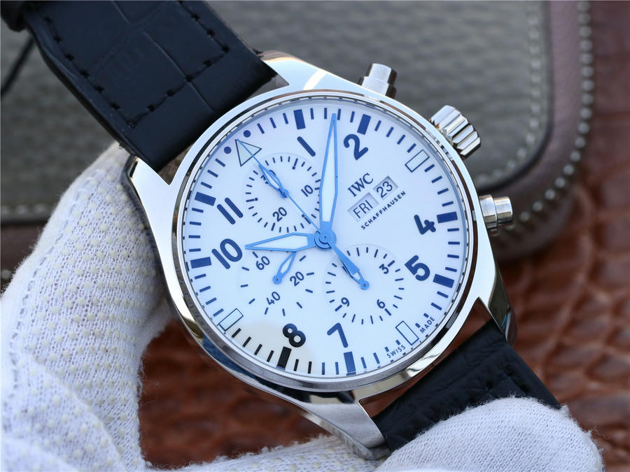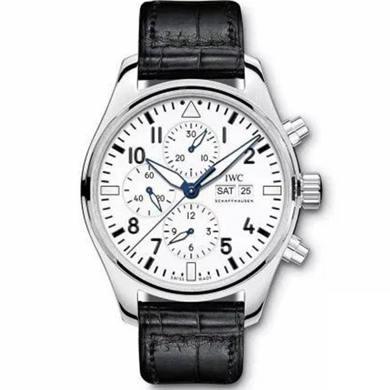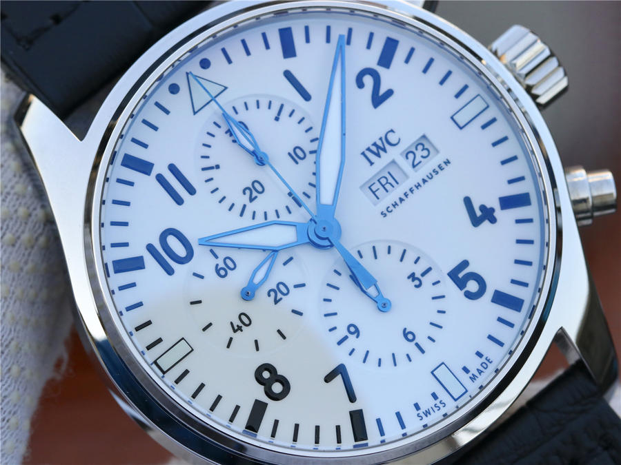 zF出品新款2003年至今,IWC萬國表以噴火戰機為名的飛行員腕表系列,結合萬國表特有的男士優雅與專業性能脫穎而出,精鋼材質打造的表殼,直徑為43毫米,白色漆面表盤搭配藍色指針,3點鐘位置設有星期和日歷顯示窗口,6點鐘位置是12小時計時盤,9點鐘位置為小秒盤,12點鐘位置則是30分鐘計時盤,表底鐫刻萬國150周年紀念圖案,內部搭載79320 自動上鏈機芯,可以提供44個小時的動力儲備。IWC萬國表飛行員系列IW377725腕表