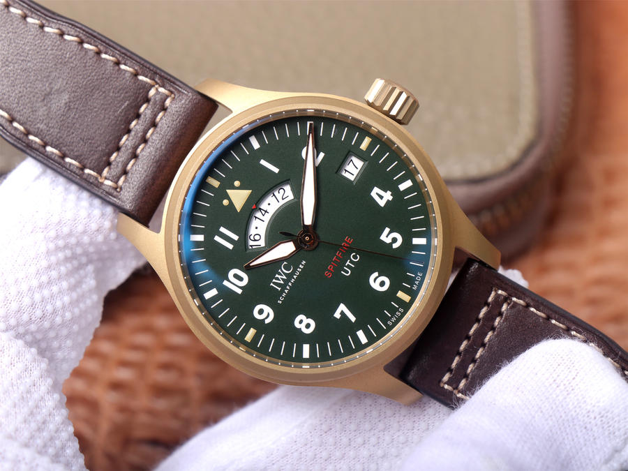 ZF功能大作——IWC噴火戰機飛行員UTC世界標準時間腕表 “MJ271”特別版震撼出擊,敬請廣大表友熱品!n腕表尺寸41mmX14.1mm 身披青銅戰甲 復古精悍 更迎合亞洲人腕圍!nn【三大獨有熱點】:n1.材質同步原裝:表殼采用青銅,底蓋和表扣則為鈦合金打造。n2.功能吻合正品:機芯擁有日期和時分秒三針功能,同時12點位置的扇型日歷窗為第二時區。n3.實現調試壹致:螺旋式表冠逆時針撥開為上發條,檔位操控日歷,第二擋位調整UTC(第二時區),後壹檔管理時針。nn【兩大靈魂復刻】n1.ZF沿襲壹貫對表盤顏色的追求。所出品的橄欖綠盤面效果和原裝壹致,在不同的光線條件下會呈現深淺不同的效果。n2.時隔多年,ZF已參透IWC的靈魂精髓,通透無比的雙面防反光凸狀藍寶石玻璃表鏡,效果與正品持平。nnZF出品 必屬精品 n因為用心 所以出彩