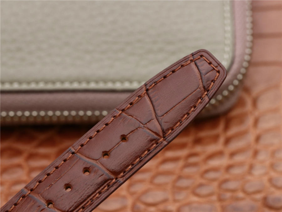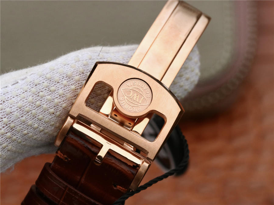【表帶表扣】采用意大利小皮材質表帶,質地柔軟細膩,手工縫制的絲線,紋路清晰,均勻規整。配備壹枚原版開模的IWC折疊表扣,上面刻有“IWC”萬國的經典標誌,大方富有檔次,做工同步原裝。