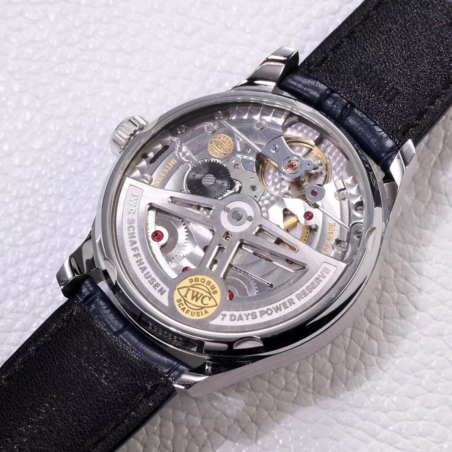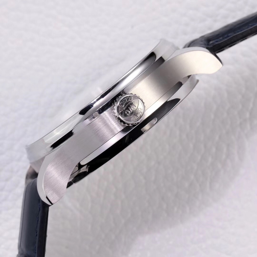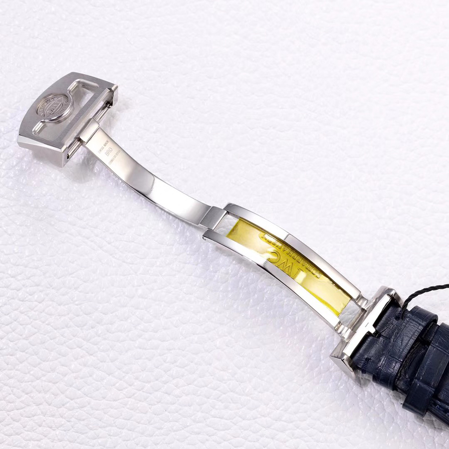 ZF廠新款萬國萄七IW500705機芯是52010,尺寸42.3X14.5搭配牛皮表帶,尺寸方面符合大多數人的手腕。雖然表盤內有2個小盤,但給人的感覺還是非常簡約的,9點鐘位置是獨立的小秒盤並不是計時盤,3點鐘位置是動能儲存顯示盤。指針包括阿拉伯數字刻度都是烤藍鋼,正面看去指針顏色呈黑色,反光去看呈現藍色,這是烤藍鋼的特點。ZF廠的葡七是采用復制原版機芯,機芯外觀相對來說還原度還是很高的,但是每壹個復制機芯和原版都存在壹定的差距,只是機芯外觀和原版的非常接近。表帶搭配的是牛皮表帶。白面款壹般可以配黑色、深藍色和棕色三款顏色可選。