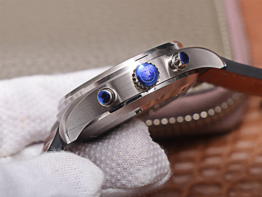 【精彩細節】1.ZF沿襲萬國表的傳統技藝,采用雙層淺藍色防眩暈鍍膜。2.分針秒針的尾部微微彎曲,細節吻合正品。